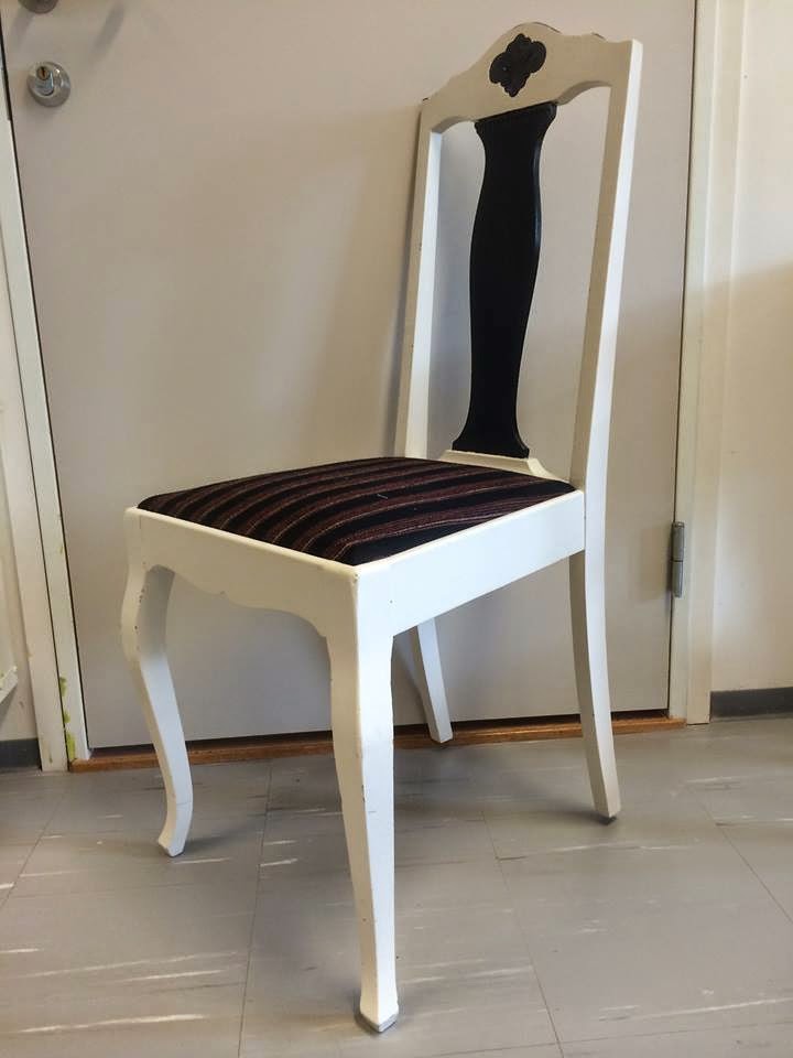 Begynn først med å finne en gammal stol, så pusser du av den gamle malinga med sandpapir og tørker over med fiberklut. Hvis stolen ikke er malt før, er det lurt å ha på heftgrunn. etter at du har malt stolen med heftgrunn kan du begynne å male. Jeg malte stolen først hvit, lurt med ett par lag. Under malte jeg stolen min med matt svart maling, for å få en kontrast. Til stripe detaljene brukte jeg maskeringstape sånn at malinga ikke skulle kline seg utover. Det er lurt å fjerne maskeringstapen like etter at malinga har tørka!